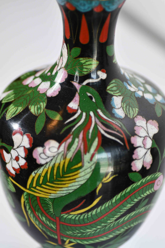 Cloisonne Black Vase with Peacock, 9"
