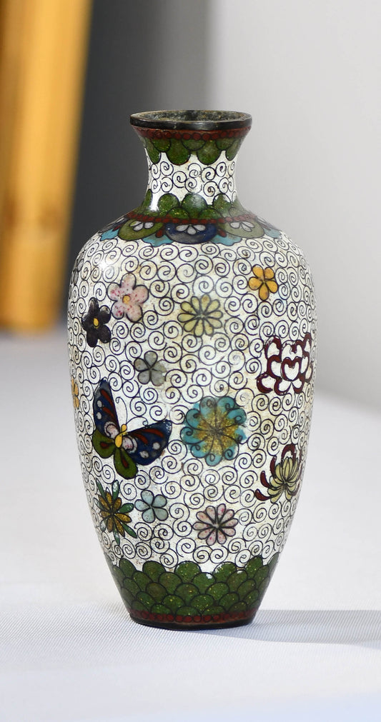 Cloisonne White Floral Vase with Butterflies, 6"