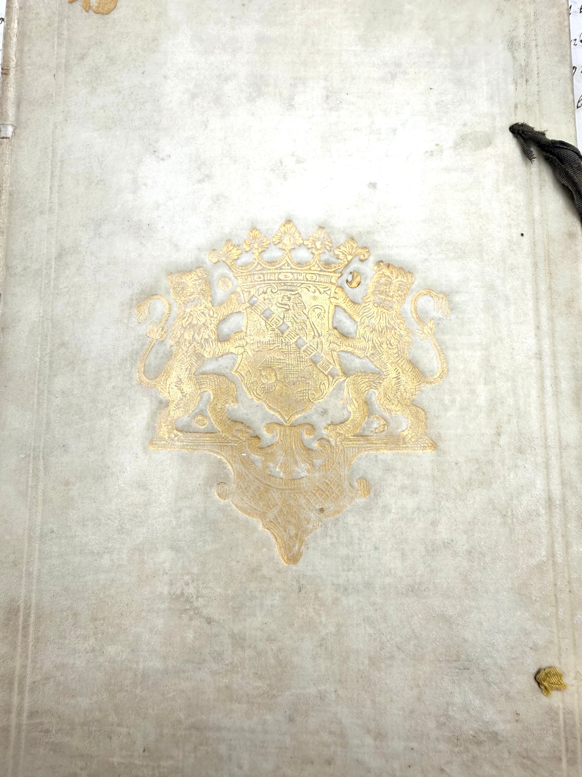 Aesop’s Fables from the 18th Century presented in an armoral vellum binding. Copyright 1778 in Latin language. "Fabularum Aesopiarum, curante Petro Burmanno". The vellum cover is white with some light soiling. The gilt coat-of-arms is bright. There are two fragile brown ribbons on on the outer edge with two missing. There is a placeholder ribbon inserted on the back inside cover. The pages are white with areas of foxing. There is nice texture on the pages. There is one detailed black and white engraving and an index in the back. 9", 258 pages + index.