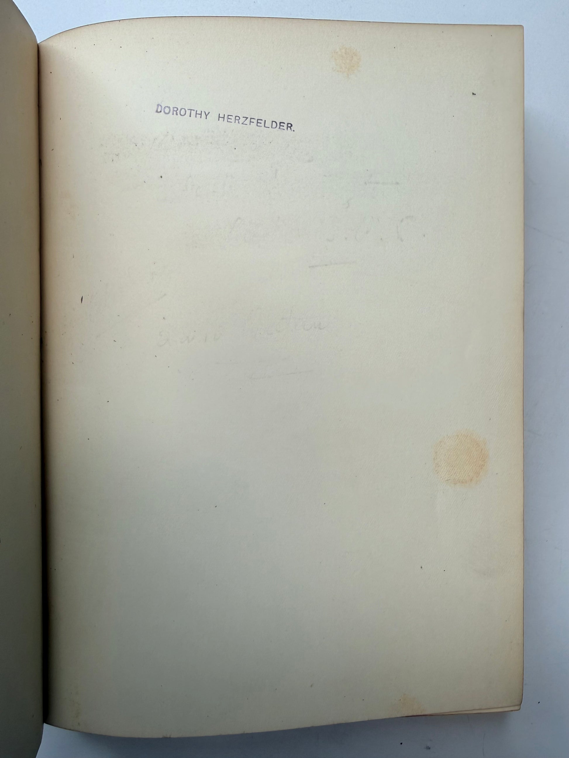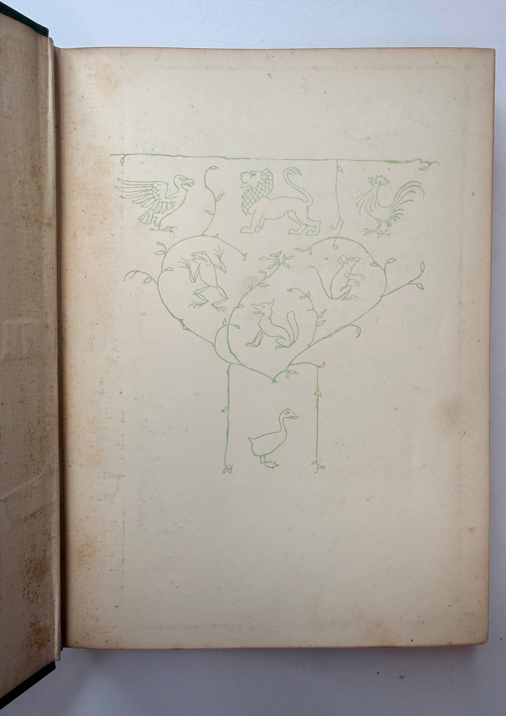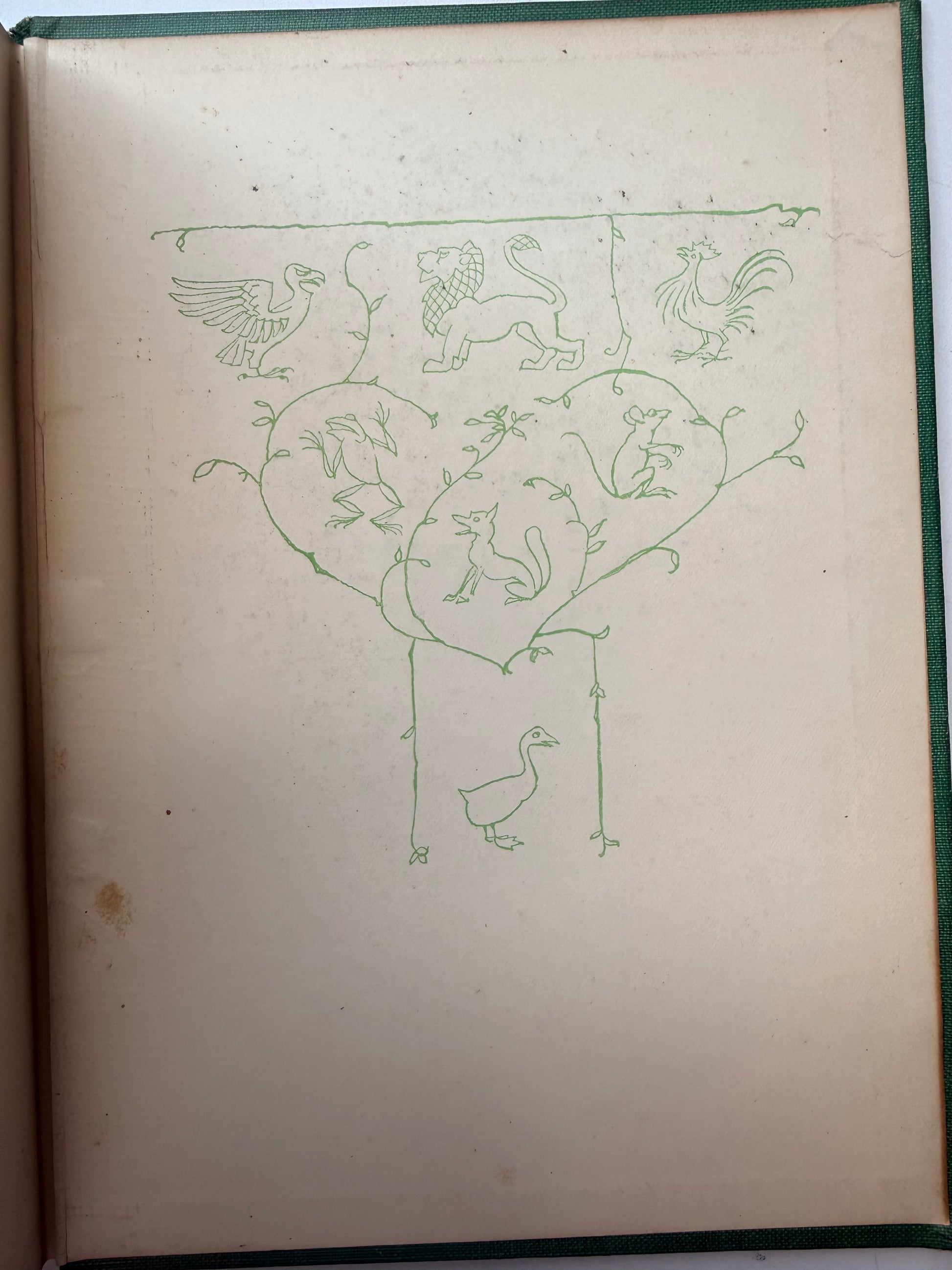 Aesop’s Fables. Translated by VS Vernon Jones with an Introduction by G K Chesterton. Full of stunning color plate illustrations by Arthur Rackham. Published by William Heineman, New York, London. Copyright 1912. A collectible edition with somewhat dark and detailed illustrations that weren't intended for children. There are slight bumps on the cover corner cloth. The backstrip cloth is slightly darkened. There is foxing in the gutter on the endpages and black speckles on the rear endpages. There is a private collection stamp on a blank pre-title page. The pages are crisp and mostly white throughout. Size: 8.25", 224 pages.