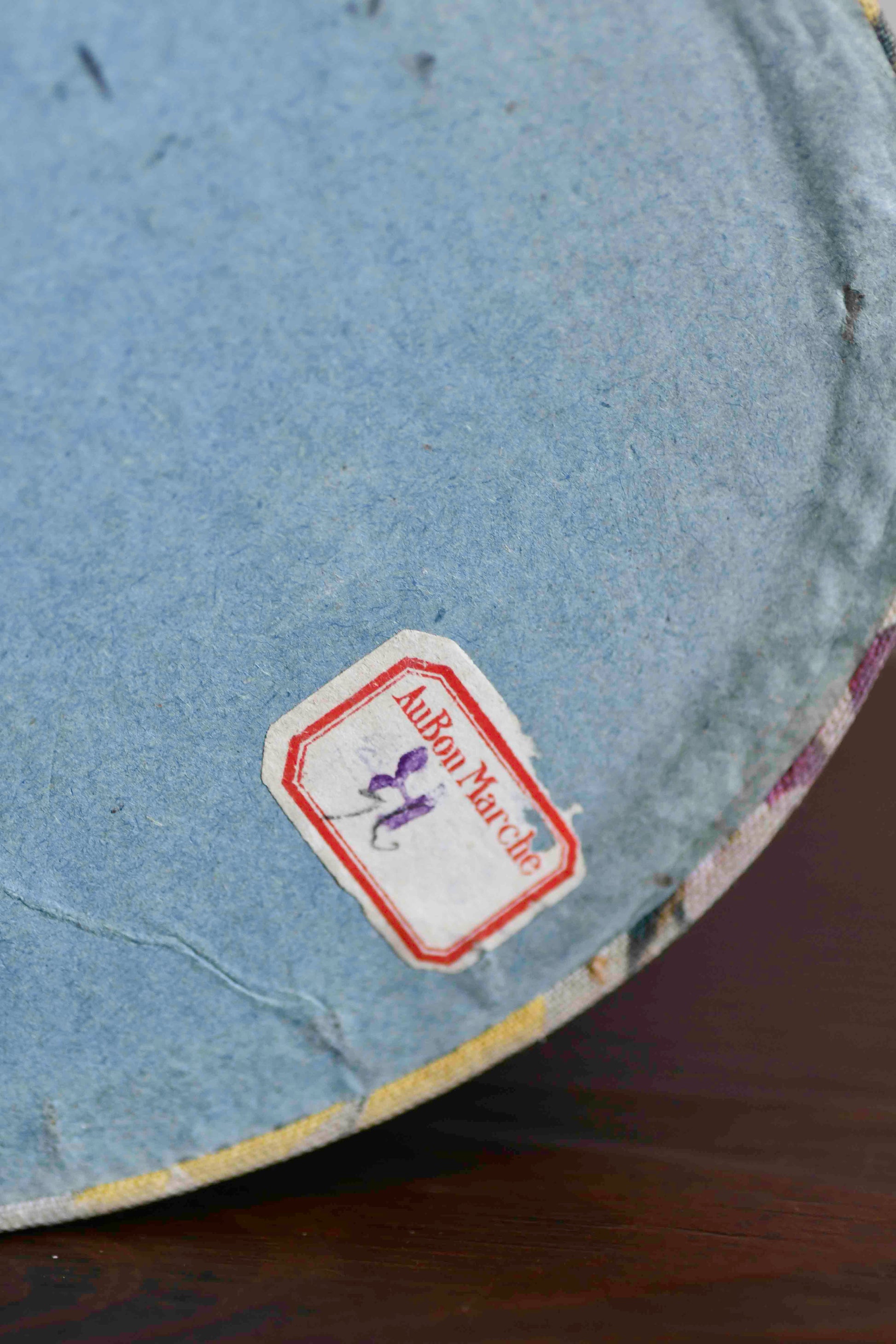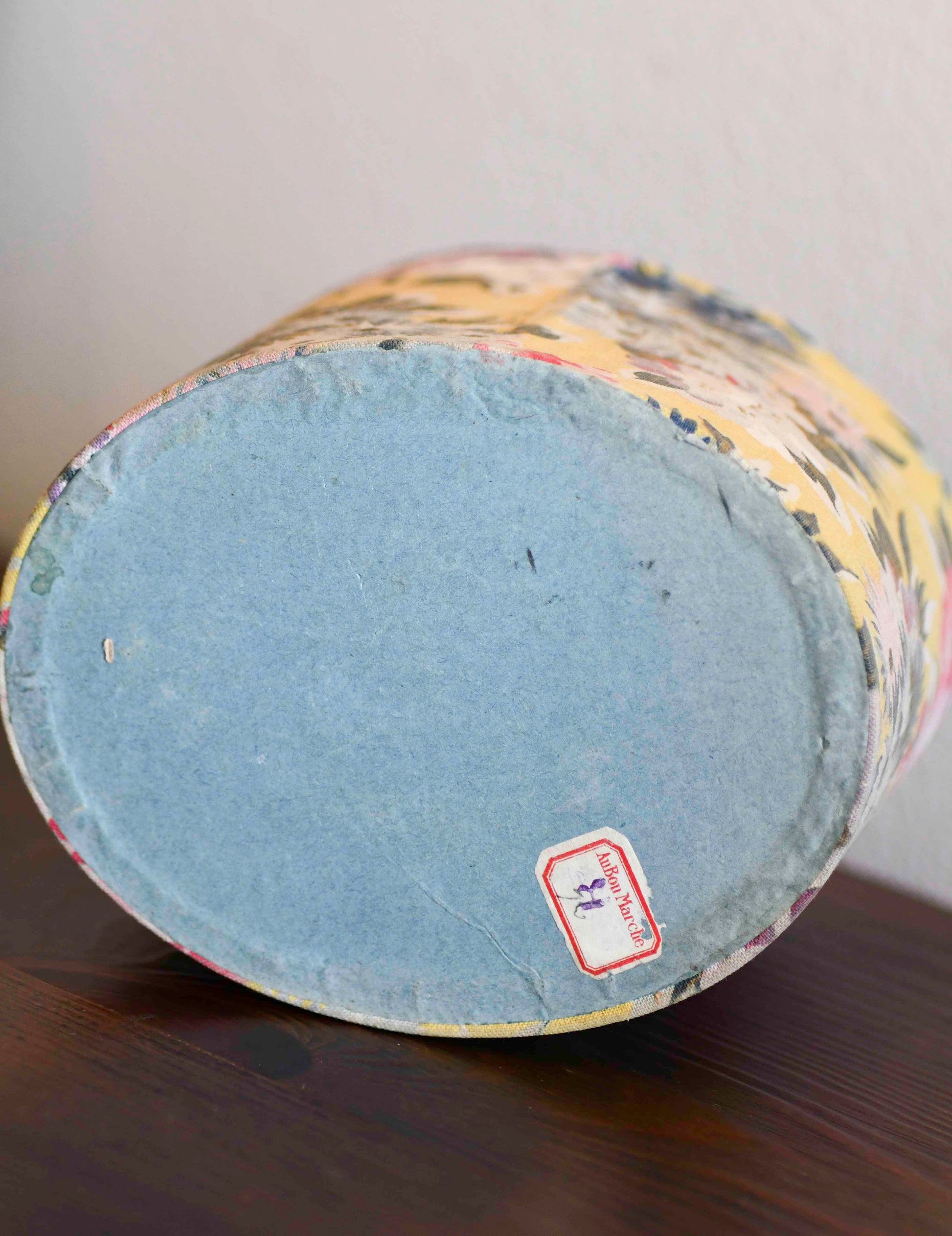 A decorative vintage French boudoir cloth or sewing box for a gift, special items, storage, collectors or other home interiors. The outer textile is a beautiful shade of yellow with varying shades of pink, blue and purple flowers with white. The outer edge of the lid is a textured bronze color that is securely connected to the lid. The interior is very good with bright green and yellow floral paper. The base is covered in pale blue paper with a paper label that reads, AuBon Marce. The box is oval in shape. The lid top is slightly faded. Provenance: France. Date of origin is unknown. Size: 6.5 W x 5” T. Free U.S. shipping at checkout.