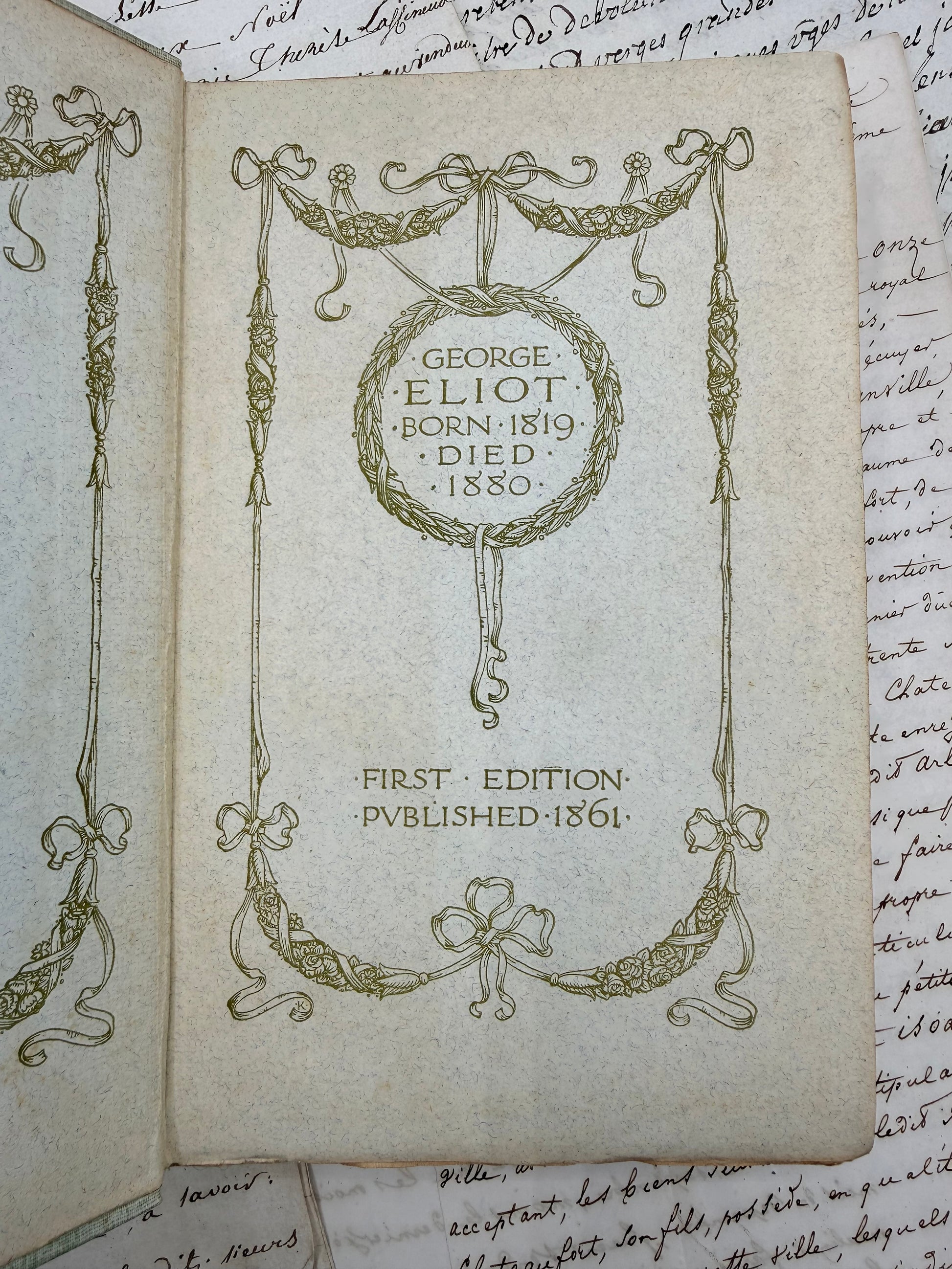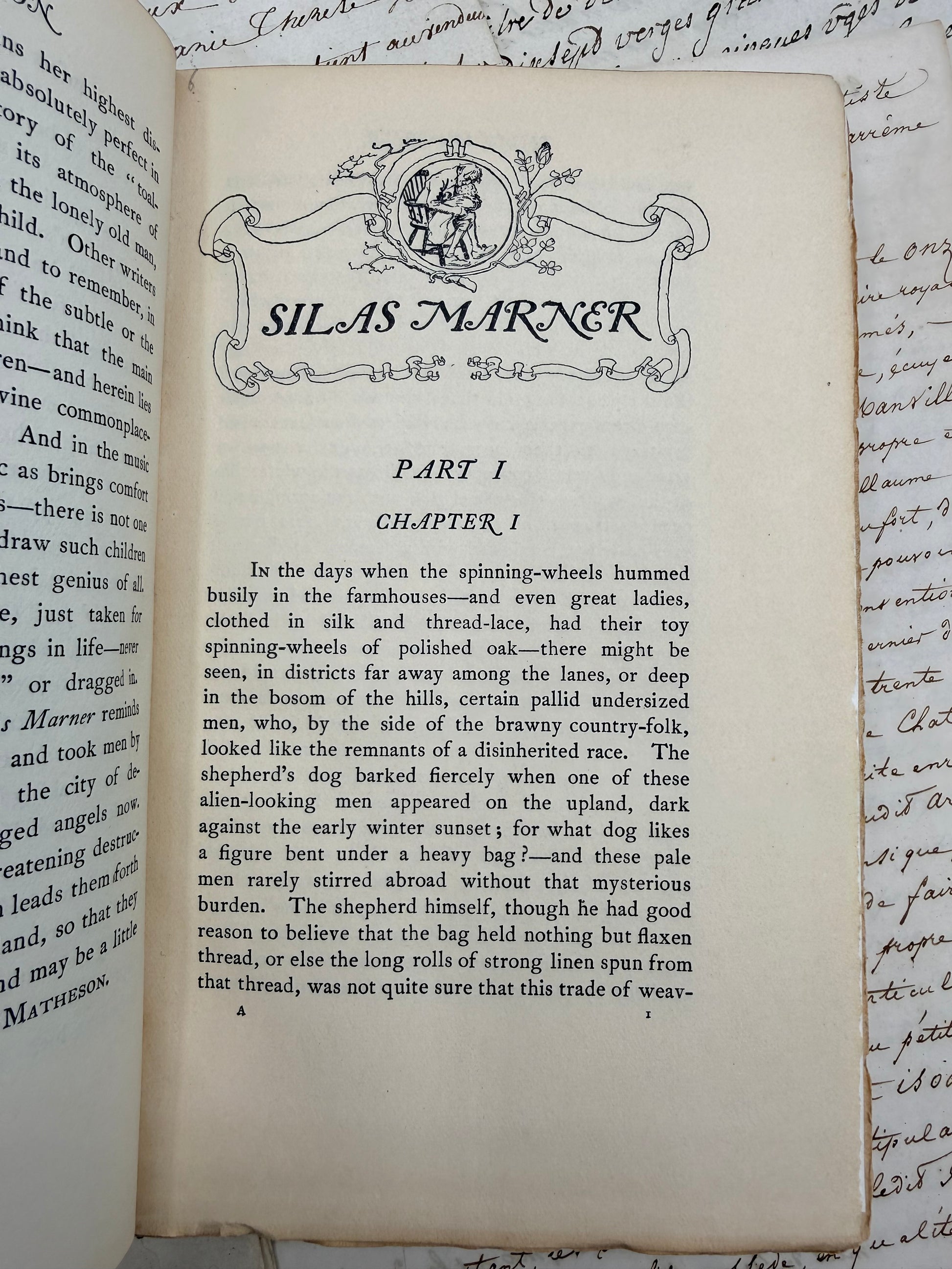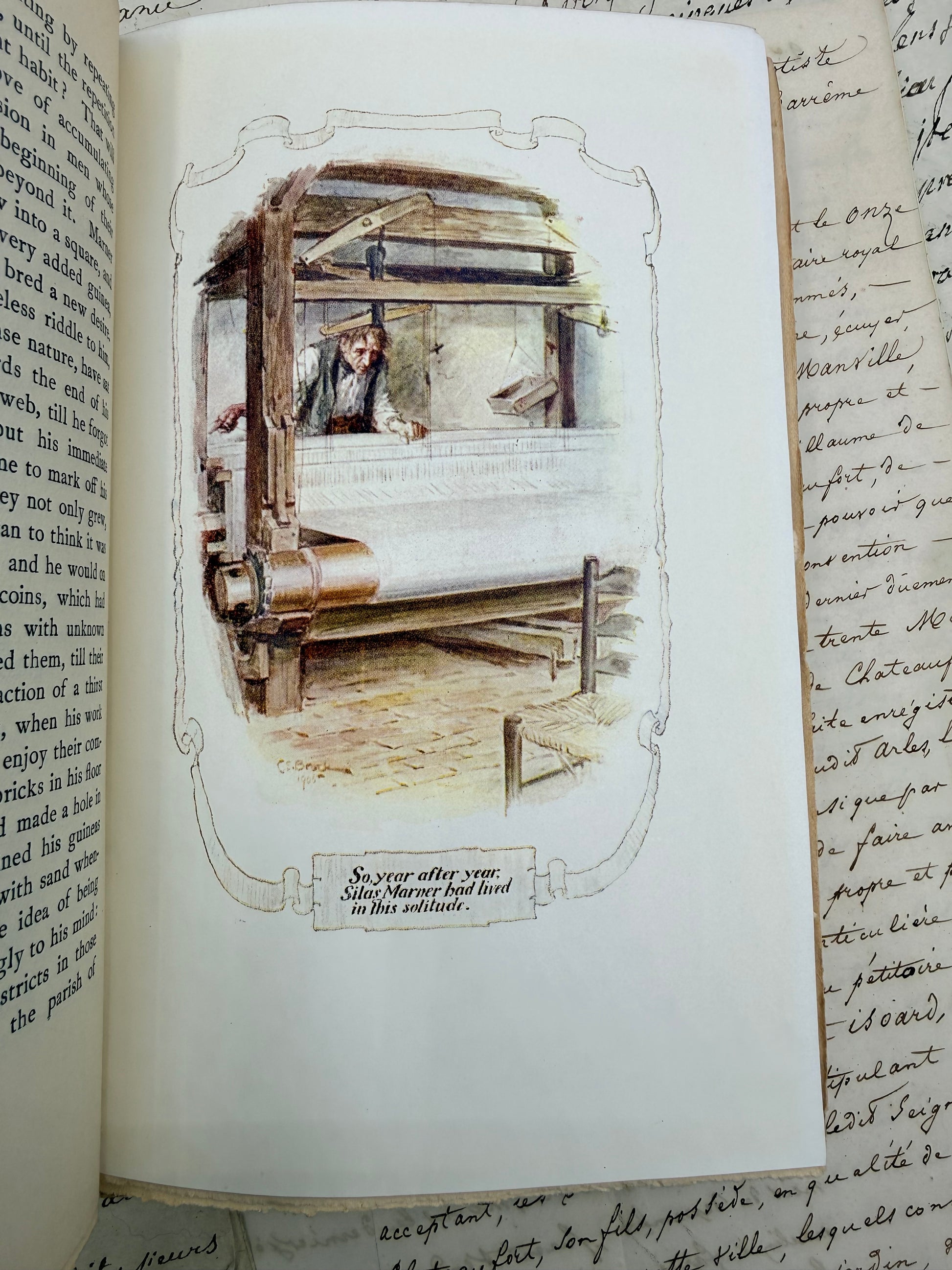 Silas Marner in a Victorian gilded binding. Illustrated by C E Brock. Published in 1905 by J M Dent, London. Please see photos for condition. The pages are moderately to heavily tanned throughout. There is an occasional small foxing spot, particularly around the illustrations. Size: 7.75" 262 pages.