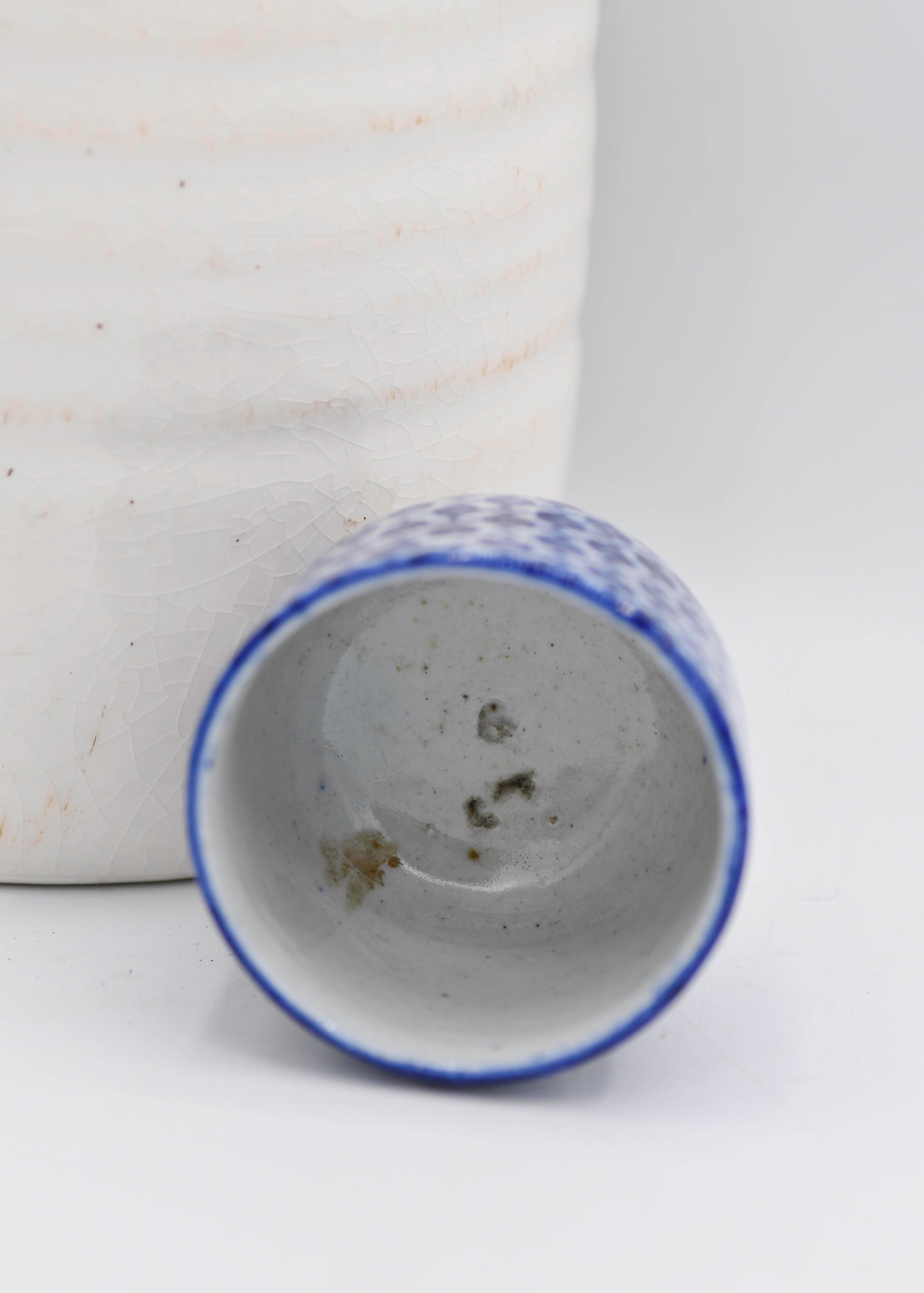 A decorative vintage blue and white teacup for collectors or home interiors. The cup is small and blue & white with a unique pattern. The cup is bright deep blue with a pretty blue rim and a creamy smooth interior. There are some darker firing spots inside. There are some soiled areas on the lower rim and some blue spots on the base. There is a blue ring around the base. Style: Transferware. Size: 2.25 T x 2.25" W. Provenance: Japan. Date of origin unknown.