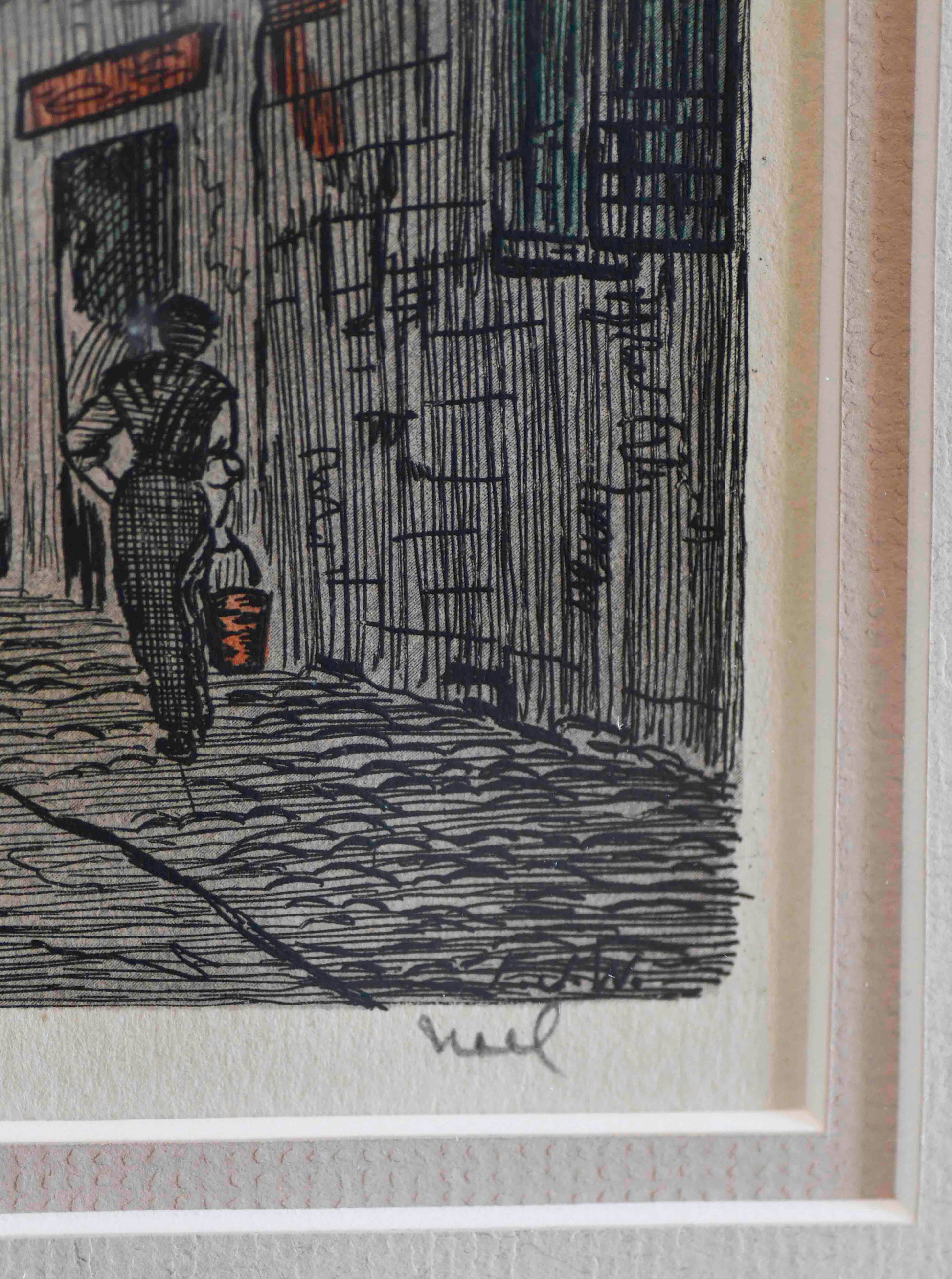 An antique watercolor on engraving by E.J.W. depicting an old street in Normandy, France. The pencil on the lower left corner reads, "In Normandy" (France). The E.J.W. initials are on the lower right corner of the image. The picture feels moody with the shadow and clouds in the sky. Size: 16.75 H x 14.75 W x 1" D. The engraving has shadow on the right with light on the left. There is a tower centered with an orange roof and small flag. There is other bright orange and green detail. The man in the lower right corner is carrying a bucket. The picture is matted with a pink inner rim and a beige outer rim. The frame is gold with a decorative textured border, and framed by 'The Great Frame Up' store (modern). There are a few bumps on the outer edge of the frame (pictured). Date of origin is unknown. Free U.S. shipping at checkout.