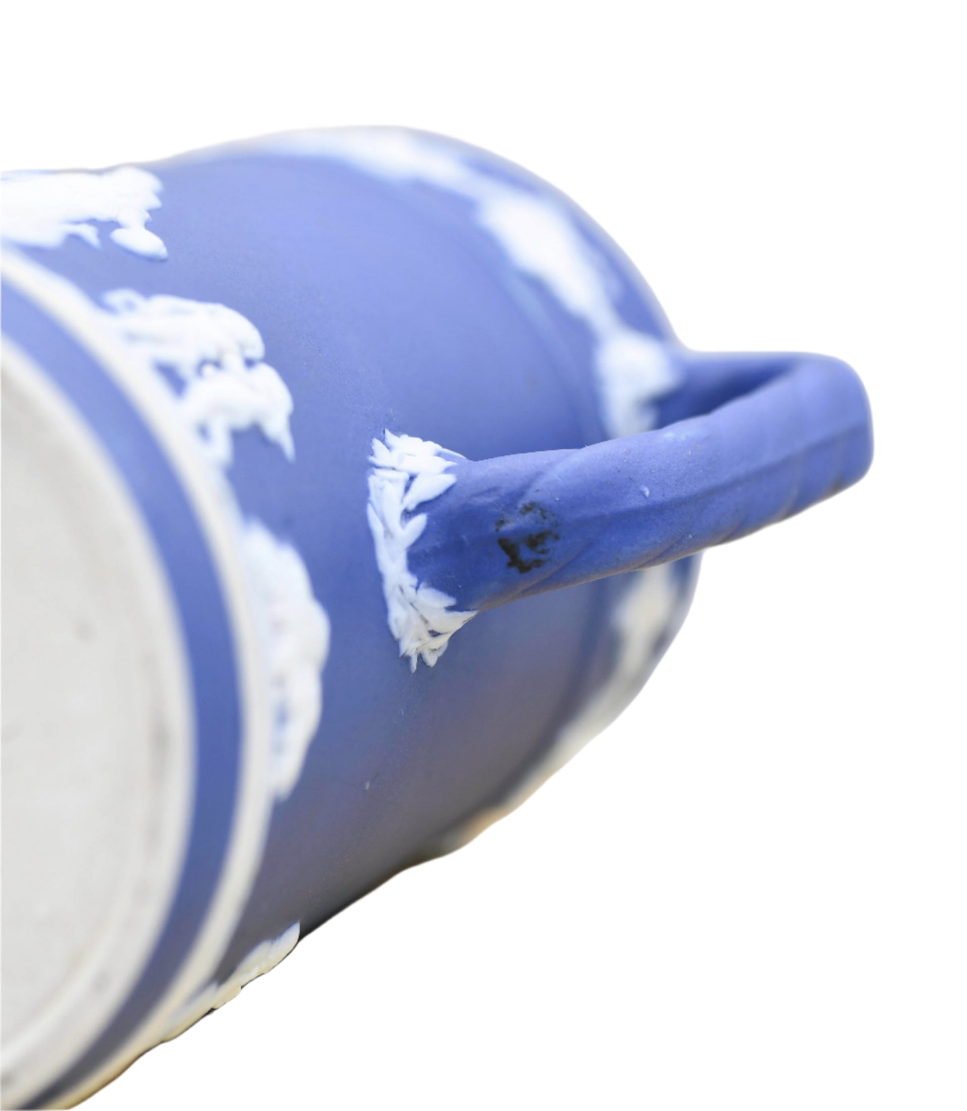 A decorative blue Wedgwood small pitcher or creamer with white porcelain overlay. The pitcher is matte medium blue jasperware. The white overlay decoration is raised depicting females, trees, cherubs, and botanicals. There is light soiling along the white upper rim. The pressed Wedgwood seal is on the base. There is light soiling on the handle. There are no chips or cracks. Lightweight. The color of blue is slightly darker / deeper than pictured in regular light. Size: 4.65 x 4". Date of origin is unknown. Provenance: England. Free U.S. shipping at checkout.